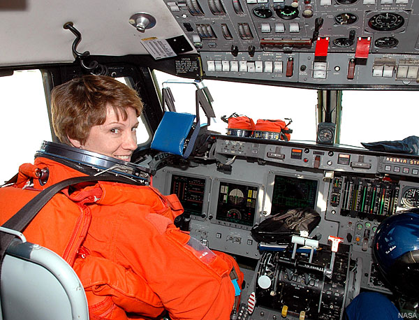 Commander Eileen Collins practices landings in the Shuttle Training Aircraft.