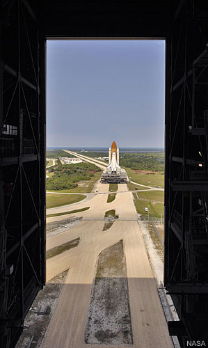 Shuttle Discovery rolls out of the cavernous Vehicle Assembly Building.