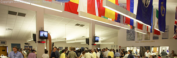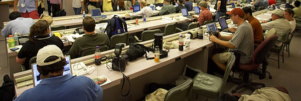 A different kind of control center: The NASA news center, where media organizations large and small report on the launch. Roughly 2,650 media personnel were accredited for this launch, an overflow crowd that spilled into portable trailers, tents, and RVs. The demand for power was so great that NASA's "green monster" generator was overloaded and killed and had to be replaced!