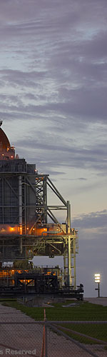 Up until the evening before the launch, the Rotating Service Structure protects the Shuttle and allows technicians to access the Shuttle for final preparations.