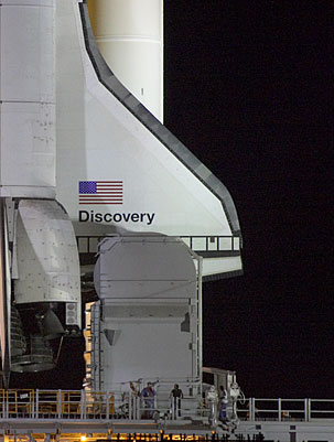 With the RSS rolled back, Shuttle Discovery is finally revealed. The rollback was delayed for several hours after a window cover fell off and damaged the shuttle's tiles. This was an embarrassing moment for NASA, who had spent two years trying to eliminate items that could fall onto the Shuttle!