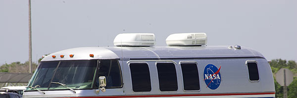 The astronauts climbed off the shuttle to wait for another day. Here they are being driven back from the launch pad.