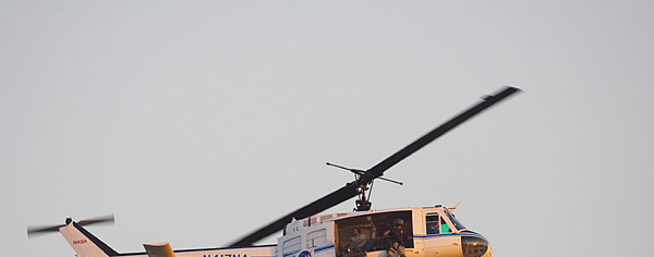 The astronauts are protected by this machine gun packed Huey. With flamboyant piloting, it swoops low and fast, checking the astronauts' route.