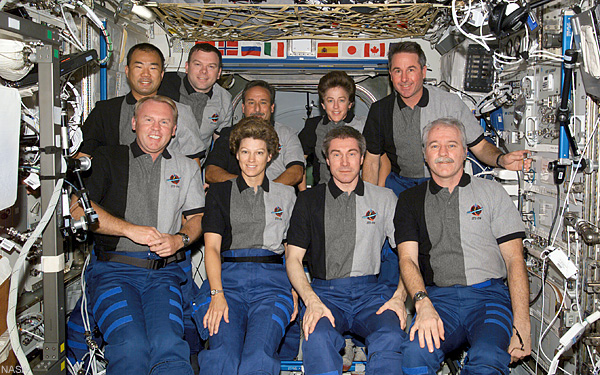 The crew of STS-114: Stephen K. Robinson, James M. Kelly, Andrew S. W. Thomas, Wendy B. Lawrence, Charles J. Camarda, Eileen M. Collins, and Soichi Noguchi.