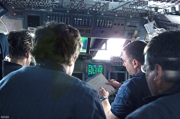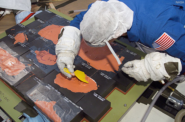 The return to flight took more than two years because of the time required to prove the cause of the Columbia accident, and the time to develop methods to eliminate and repair damage. Here an astronaut tests a tile repair technique on simulated damaged tile.