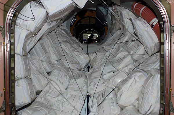 The 'bungee jail', items waiting to be transferred between the shuttle and station.