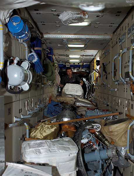 With the halt in shuttle flights, 2 1/2 years of trash have been piling up. Here Sergei navigates through the nearly ceiling-high collection.