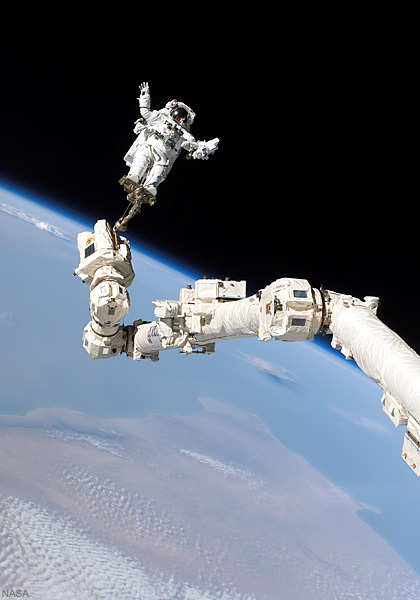 Look ma, no hands! Spacewalker Stephen Robinson gets a ride on the space station arm.